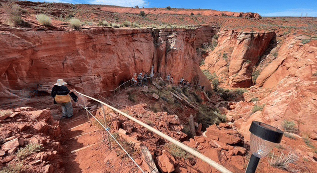 - Access the canyon on a 30-yard trail and climb two stairwells with handrails